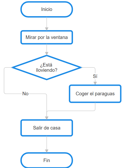 - Ambas flechas (la que sale de «Coger paraguas» y la que salía del «No») se unen y apuntan a un rectángulo final que dice «Salir de casa».